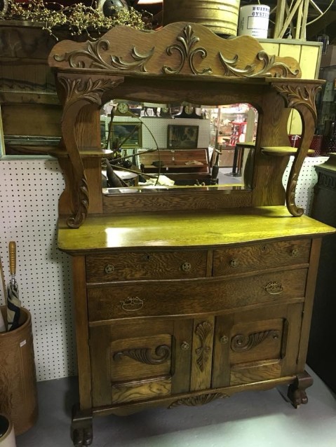 Victorian Quarter Sawn Tiger Oak Server with beveled mirror.
